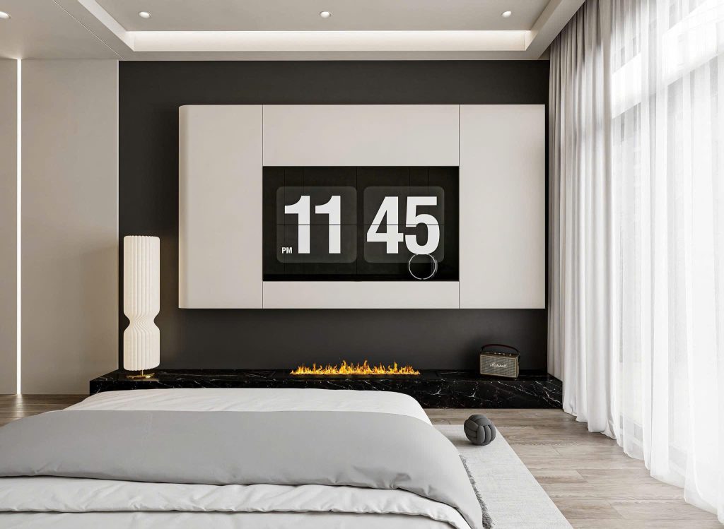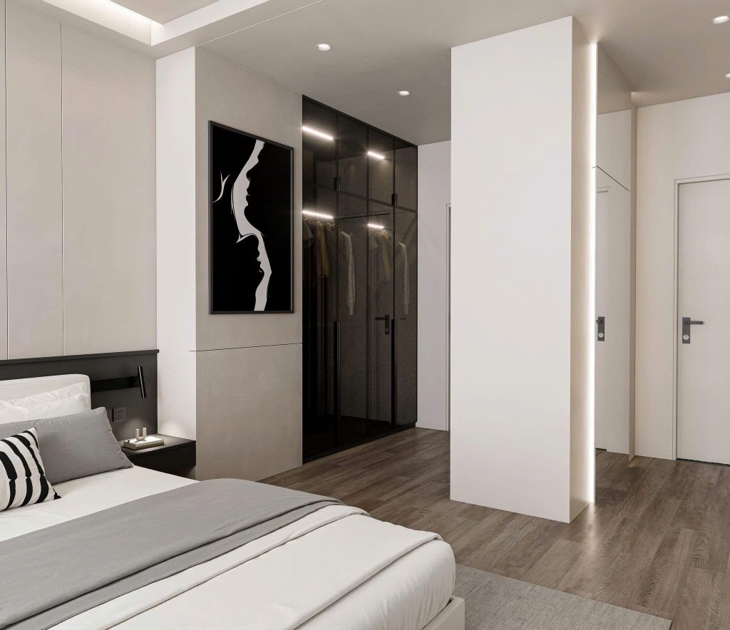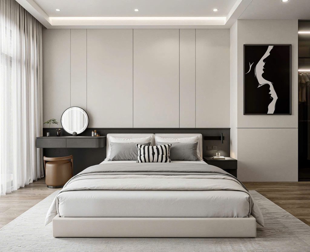 • Tủ tivi & vách ốp đầu giường: tone màu đồng bộ, ốp phẳng liền mạch giúp không gian rộng và gọn gàng hơn