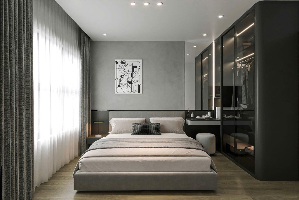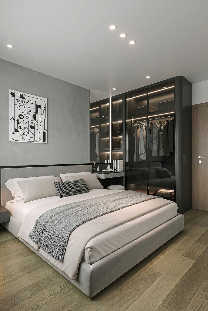 - Hệ tủ quần áo cửa kính đen bóng giúp mở rộng không gian, đồng thời tạo điểm nhấn hiện đại và đẳng cấp.